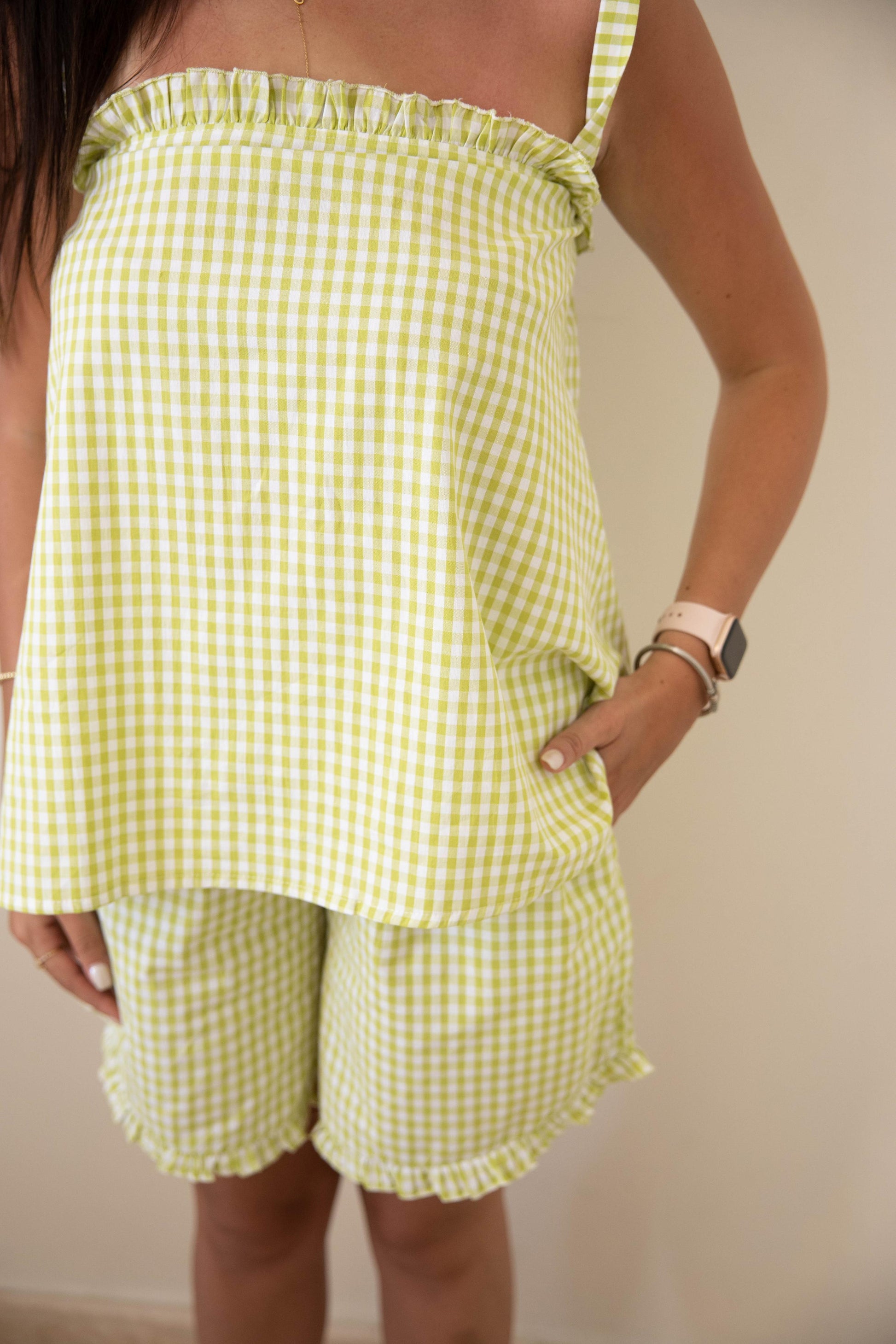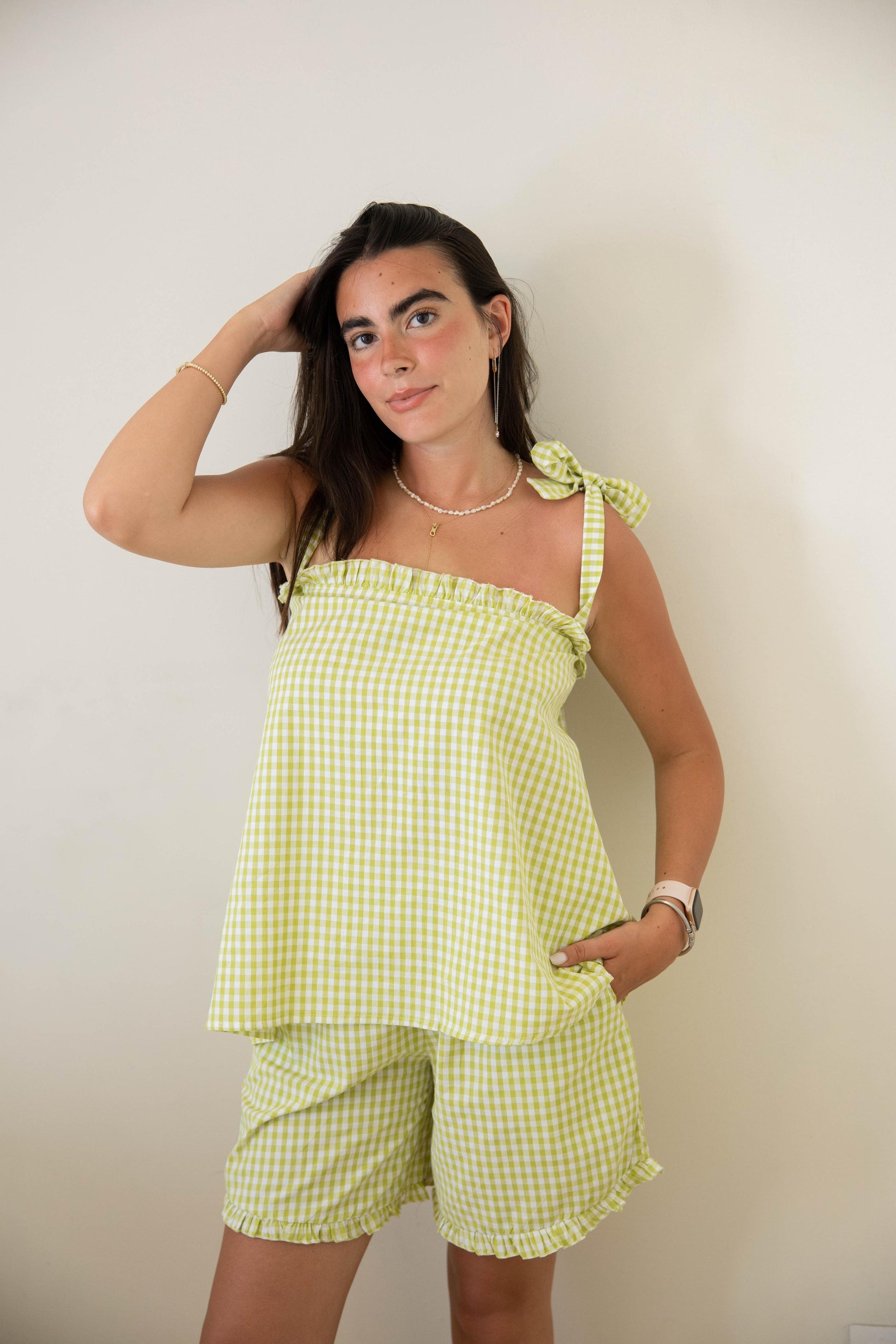 Meet Sour Bow β your new summer fave! π This lemony plaid set comes with ruffled shorts and a sleeveless top featuring a flirty shoulder tie. Made from soft, breathable cotton, itβs the perfect mix of sweet and sassy for sunny lounging days.